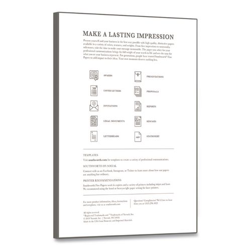 Nothing equals the rich texture of Southworth® 100% Cotton Resume Paper. Its distinctive crispness provides a feeling of substance that makes both an immediate and a lasting impression. Perfect for resumes, cover letters, thank you notes and more. It's your story, how you tell that story matters. Trying to land the job is a full time job, from tweaking your resume to networking, career fairs to preparing for interviews. Through it all, you need to develop and tell the story of you. How you share that story matters. The paper you choose to share it on is important. From the first moment to enduring memory, the cotton in Southworth® Resume Paper adds a touch of class. Cotton paper makes first impressions more impressive with a distinct crispness and an unmistakable feel. Someone picking up your resume will know, before they even read a single word, that there's something special to it. Be prepared to share your story at your next interview. Present your resume on Southworth® and rise to the top of the stack.