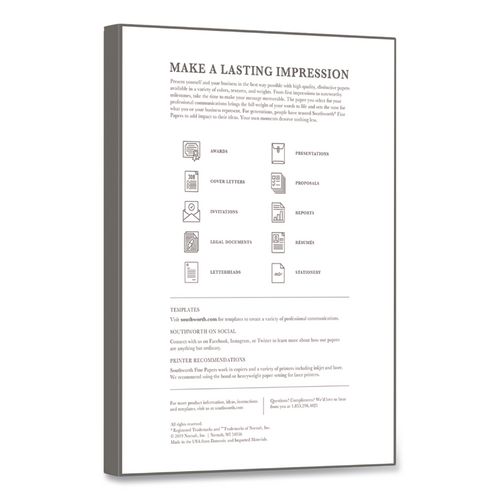 Nothing equals the rich texture of Southworth® 100% Cotton Resume Paper. Its distinctive crispness provides a feeling of substance that makes both an immediate and a lasting impression. Perfect for resumes, cover letters, thank you notes and more. It's your story, how you tell that story matters. Trying to land the job is a full time job, from tweaking your resume to networking, career fairs to preparing for interviews. Through it all, you need to develop and tell the story of you. How you share that story matters. The paper you choose to share it on is important. From the first moment to enduring memory, the cotton in Southworth® Resume Paper adds a touch of class. Cotton paper makes first impressions more impressive with a distinct crispness and an unmistakable feel. Someone picking up your resume will know, before they even read a single word, that there's something special to it. Be prepared to share your story at your next interview. Present your resume on Southworth® and rise to the top of the stack.