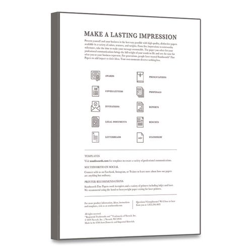 Nothing equals the rich texture of Southworth® 100% Cotton Resume Paper. Its distinctive crispness provides a feeling of substance that makes both an immediate and a lasting impression. Perfect for resumes, cover letters, thank you notes and more. It's your story, how you tell that story matters. Trying to land the job is a full time job, from tweaking your resume to networking, career fairs to preparing for interviews. Through it all, you need to develop and tell the story of you. How you share that story matters. The paper you choose to share it on is important. From the first moment to enduring memory, the cotton in Southworth® Resume Paper adds a touch of class. Cotton paper makes first impressions more impressive with a distinct crispness and an unmistakable feel. Someone picking up your resume will know, before they even read a single word, that there's something special to it. Be prepared to share your story at your next interview. Present your resume on Southworth® and rise to the top of the stack.