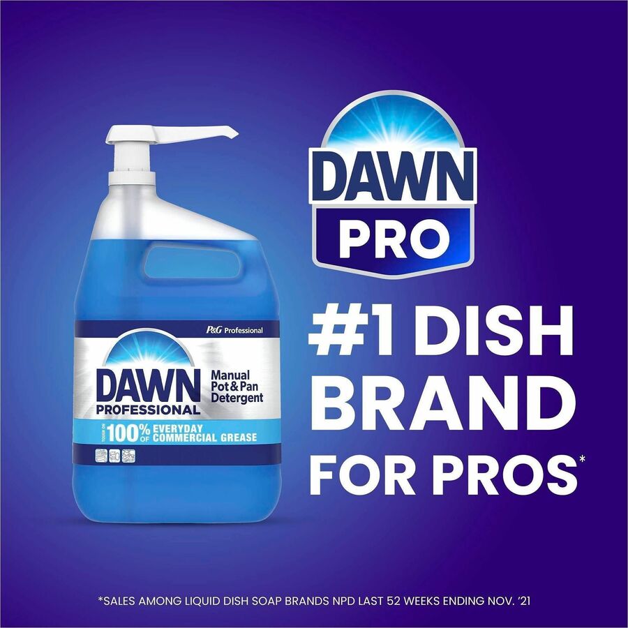 | Marketing Information | Experience three times the baked-on, grease-cleaning power with Dawn Professional's Heavy-Duty Manual Pot and Pan Dish Detergent, the best and strongest Dawn Professional formula. Made for your toughest jobs, this heavy-duty dish soap saves you time and effort with 50 percent less scrubbing from active ingredients that do more of the work for you. This means less time presoaking, less time scrubbing and more time back to you. Cut through the toughest jobs like baked/caked-on grease, dried eggs, tomato sauce, butter, potatoes, beans and more throughout your kitchen. Formula is made for the hardest-to-clean items like your pots and pans, silverware, serving utensils, baking trays, containers, serving trays, plates, plastic items and more. High level of proprietary, grease-cutting surfactants takes on the toughest pots and pans in your sink. |