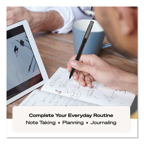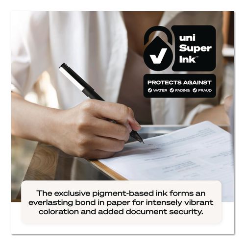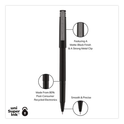 Stock your office, home or classroom with Roller Rollerball Stick Pens from uni-ball featuring strong, long lasting tips. These rollerball pens deliver the silky-smooth glide of a fountain pen without smudging for effortless writing. Roller pens produce neat and precise lines for intricate writing, making it easy to create super fine details in your drawings and diagrams. Capped roller pens are useful for a variety of tasks from note taking to signing checks and legal documents to uniquely embellishing fun and creative writing projects. Innovative uni Super Ink technology forms a strong bond with the paper, protecting from water, fading and fraud. Made from recycled material.