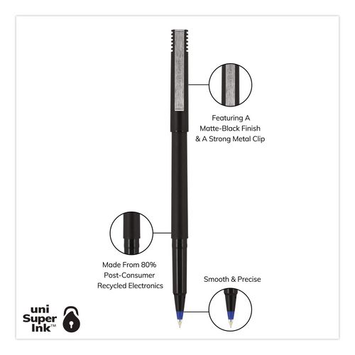 Stock your office, home or classroom with Roller Rollerball Stick Pens from uni-ball featuring strong, long lasting tips. These rollerball pens deliver the silky-smooth glide of a fountain pen without smudging for effortless writing. Roller pens produce neat and precise lines for intricate writing, making it easy to create super fine details in your drawings and diagrams. Capped roller pens are useful for a variety of tasks from note taking to signing checks and legal documents to uniquely embellishing fun and creative writing projects. Innovative uni Super Ink technology forms a strong bond with the paper, protecting from water, fading and fraud. Made from recycled material.