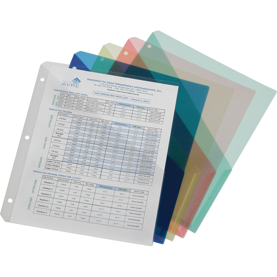 Organize unpunched papers in three-ring binders with these Three-Ring Slash-style File Jackets. Made of durable polypropylene, they resist spills and tearing while protecting your letter-size documents. Three-hole punched edge makes it easy to insert in standard-size binders. Diagonal slash pockets on each side keep documents safe yet provide easy access when needed. For easy color-coding, translucent file jackets come in one of each color: blue, green, yellow, clear and pink. |