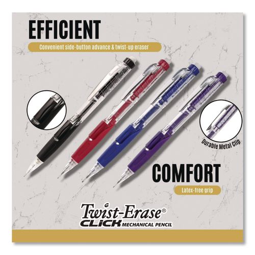 The Pentel® Twist-Erase® Click™ pencils now have new clear barrels with color accents for a stylish twist on pencils. Quick-click side button advances lead without interrupting your writing. Mistakes are no match for the larger-than-ordinary and long-lasting twist-up eraser. Cleanly erase any mistakes no smudges, no paper tears and no ghosts. The comfortable, extra-soft latex-free grip reduces writing fatigue. Pre-loaded with Pentel® Super Hi-Polymer® HB lead that never needs sharpening is super strong and produces a clear dark line.